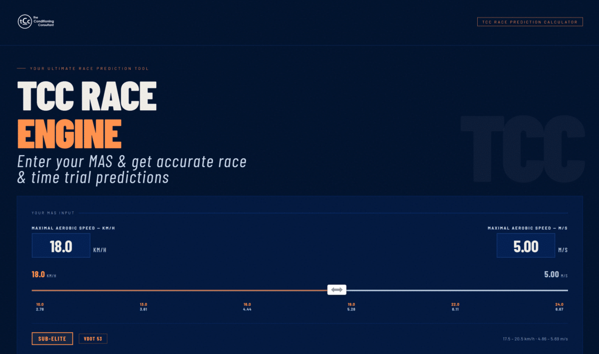 The TCC Race Prediction Calculator & MAS Race Engine uses your Maximal Aerobic Speed (MAS) to generate accurate, physiologically-grounded race predictions for 2km, 5km, 10km, half marathon, and marathon. Built on Jack Daniels’ VDOT framework and TCC’s proprietary MAS model, these are the tools serious coaches have been waiting for.